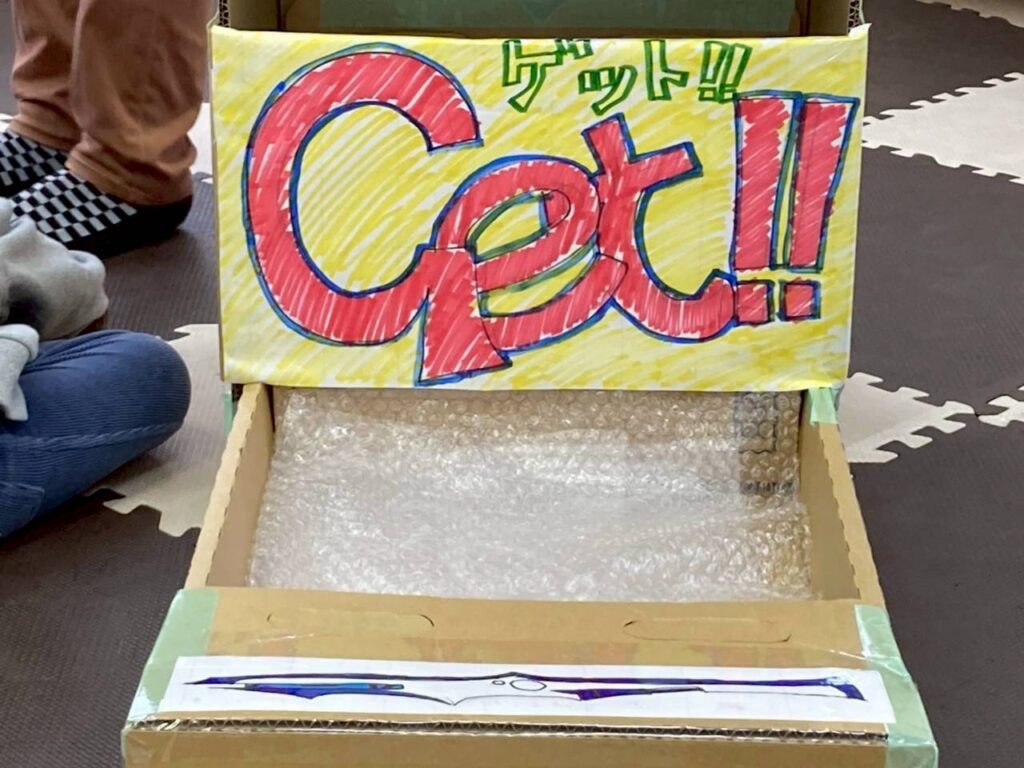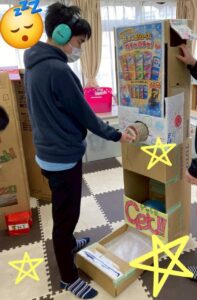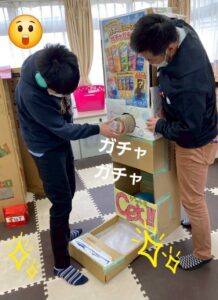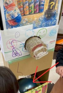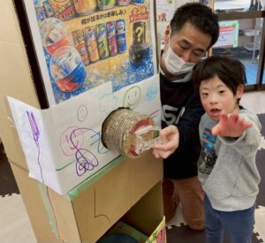 段ボールで作ったガチャガチャ。カプセルではなくジュース仕様です。