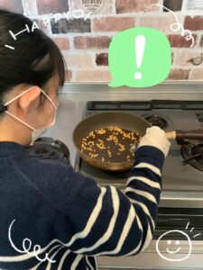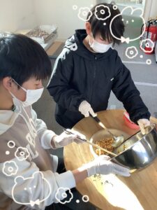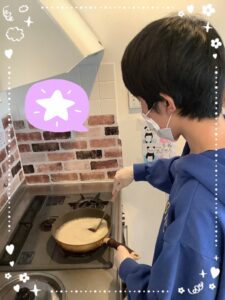 職員と火加減の調節をしながら、へらを使ってこげないように一生懸命混ぜていました👏